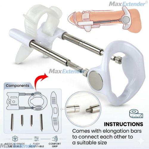 MaxExtender™ Penis Extender India Gen 3 System — Professional-grade penile traction device with reinforced aircraft-grade aluminum construction. Maximum durability for intensive daily use. Medically approved for permanent lengthening and Peyronie's correction. Includes 4 extension bar pairs, premium comfort strap, carrying case, and comprehensive guide.